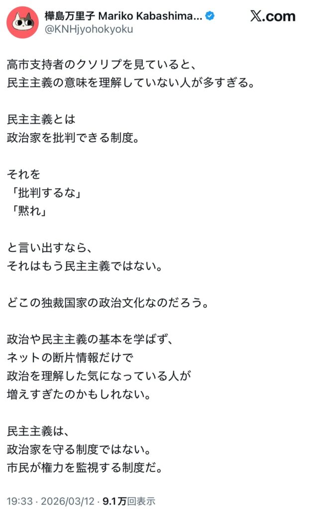 民主主義と言論の自由を履き違えている左派。民主主義の基本は多数決です、数が絶対的な正義であり、これを否定すれば全てが根底から崩れます。批判はかまわないんです、ただ言論の自由には責任が伴います。虚偽捏造は言うに及ばず、個人や人格への攻撃は「言論の自由」の範疇を超えています。